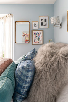 Not sure where to start, start with color! Here we pilled in similar cool tones to make these gallery wall feel cohesive and add interest to an empty space.
